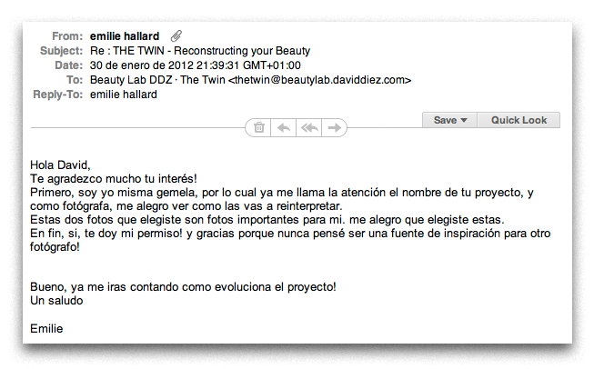 Y para cerrar descubrimos que Emilie Hallard, sin quien no tendríamos posibilidad de trabajar sobre la maravillosa imagen 01, que es de nuestras favoritas, resulta que también tiene una gemela. ¿Serán esto señales?